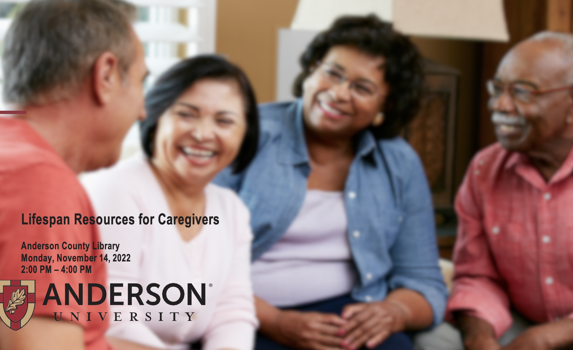 Lifespan Resources for Caregivers Kick-Off EventMonday, November 14, 2022 at 2:00 PM until 4:00 PMEastern Standard Time UTC -05:00Map and DirectionsAnderson County Main Library300 N Mcduffie StAnderson, SC 29621United StatesLifespan Resources for Caregivers Anderson University Professional and Lifelong Learning, Cancer Association of Anderson, and NHC Home Health Care collaborate to provide the community with helpful and informative resources for caregivers. Are you confused, stressed, and overwhelmed in your search for local support as you embrace the role of caregiver? Do you need to connect with local services that offer direction and support?Join community members for the first of several collaborative presentations that provide the community with the opportunity for discussion, question and answers, and connection with local assisted living, hospice, palliative and healthcare service providers. This community learning event is FREE. Invite a friend to come along and discover the many ways support is offered to caregivers throughout Anderson County. Register today for this informative and encouraging kick-off event by submitting the completed form below. You will receive an event reminder at the email address provided. For additional information, email acarpenter@andersonuniversity.eduRegistration is no longer available because the registration deadline has passed.