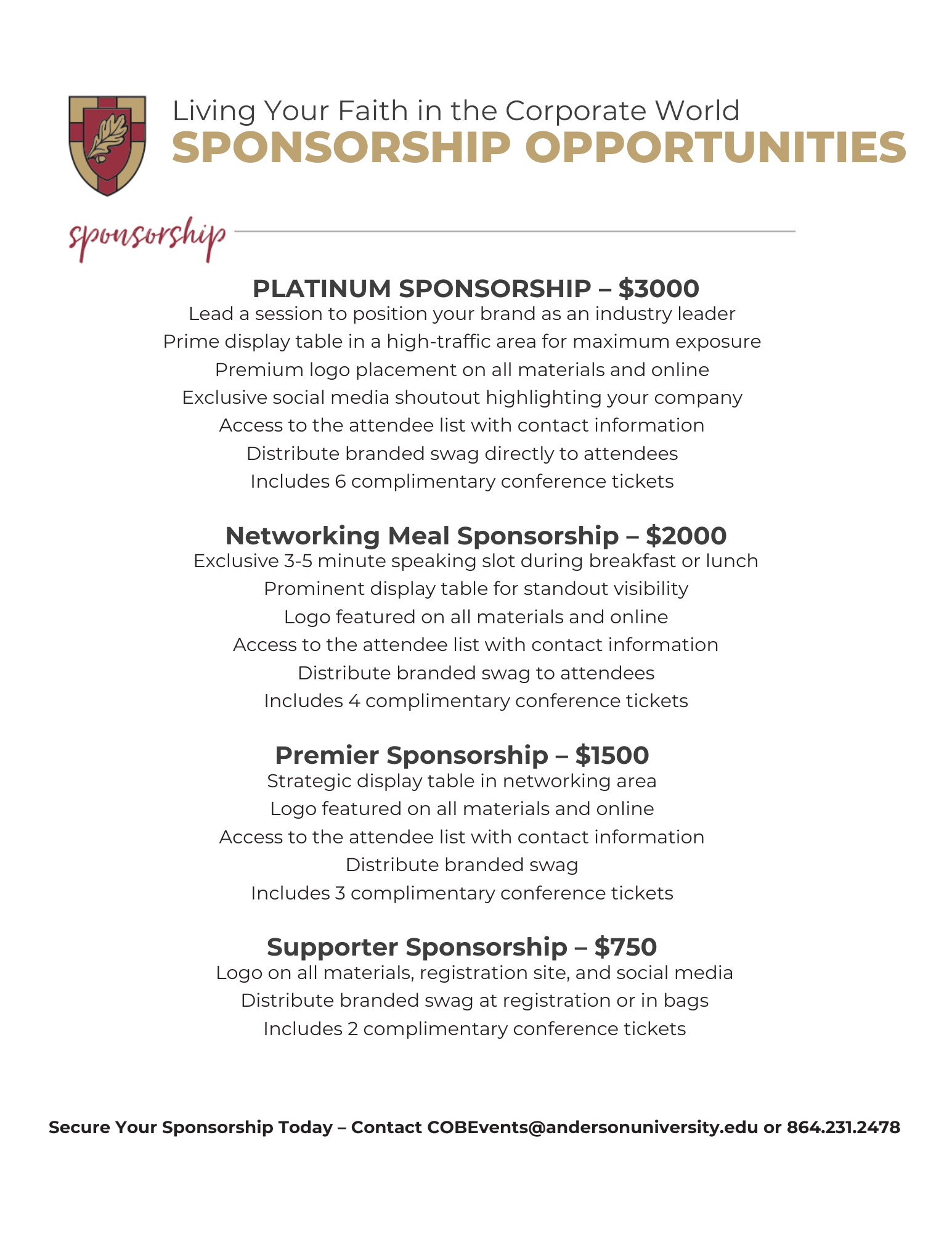 COB - Living Your Faith in the Corporate World Columbia - 2024 - SponsorshipFriday, October 4, 2024 at 9:00 AM until 4:00 PMEastern Daylight Time UTC -04:00Map and DirectionsSoutheastern Freight Lines Support Center420 Davega DrLexington, SC 29073United States Signup page Interested in becoming a sponsor? Register here or contact us for information by emailing COBevents@andersonuniversity.edu or calling 864.231.2478Registration is no longer available because the registration deadline has passed.