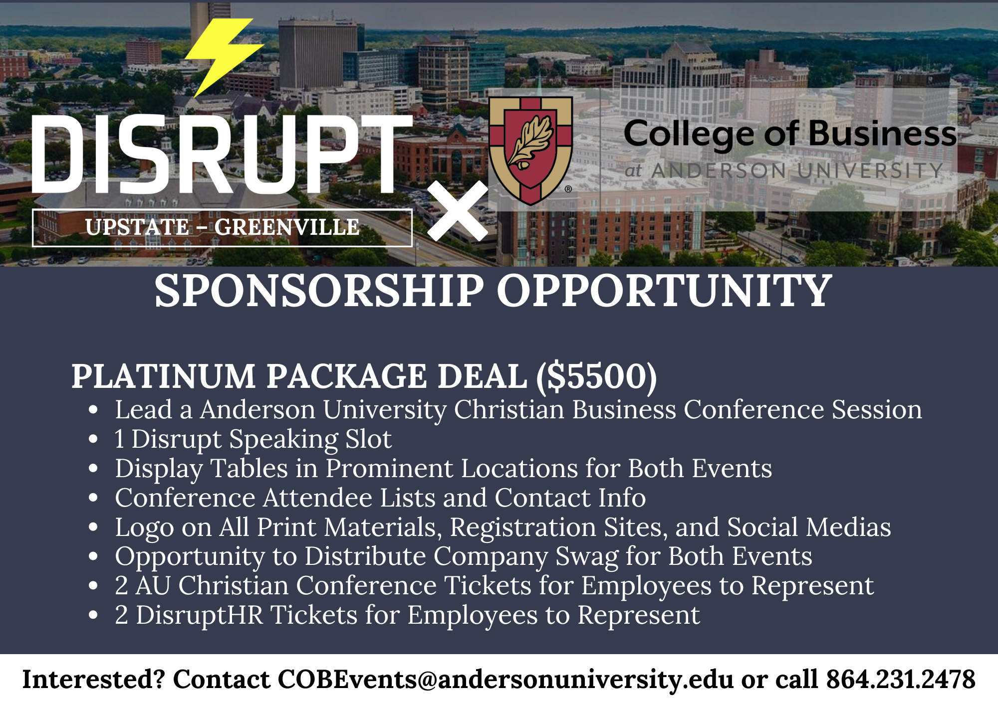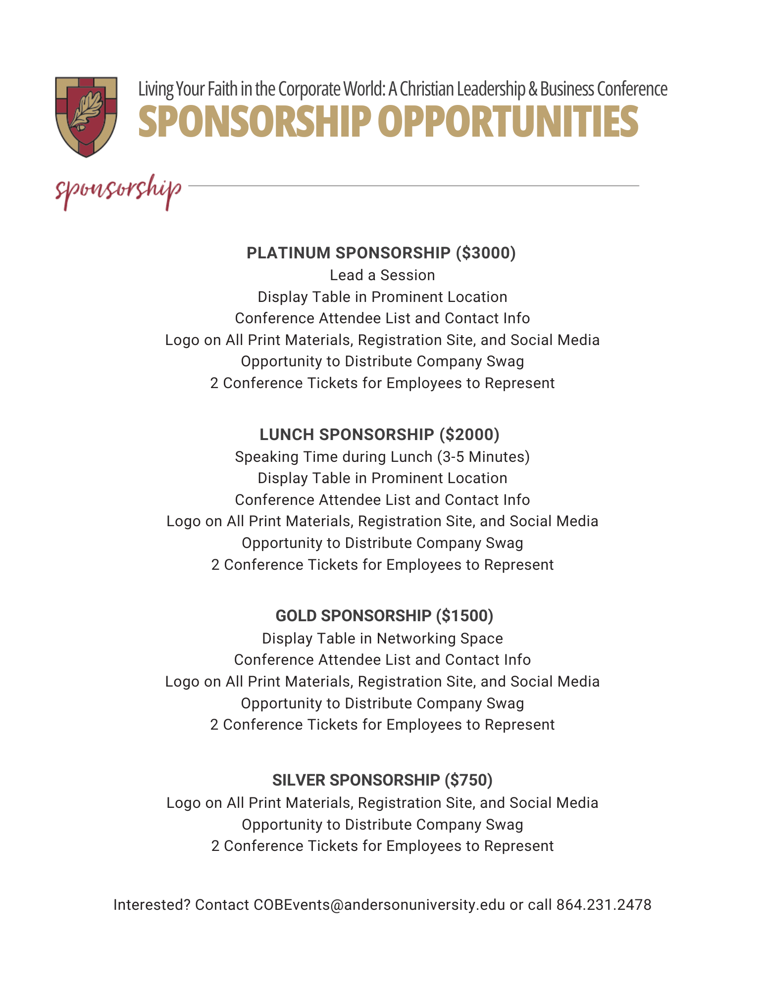 COB - Living Your Faith in the Corporate World - 2024 - SponsorshipTuesday, July 23, 2024 at 8:30 AM until 4:30 PMEastern Daylight Time UTC -04:00Map and DirectionsUniversity Center of Greenville225 S Pleasantburg DrGreenville, SC 29607United States Signup page Interested in becoming a sponsor? Register here or contact us for information by emailing COBevents@andersonuniversity.edu or calling 864.231.2478Platinum Sponsors: Lunch Sponsor: Silver Sponsors:Registration is no longer available because the registration deadline has passed.