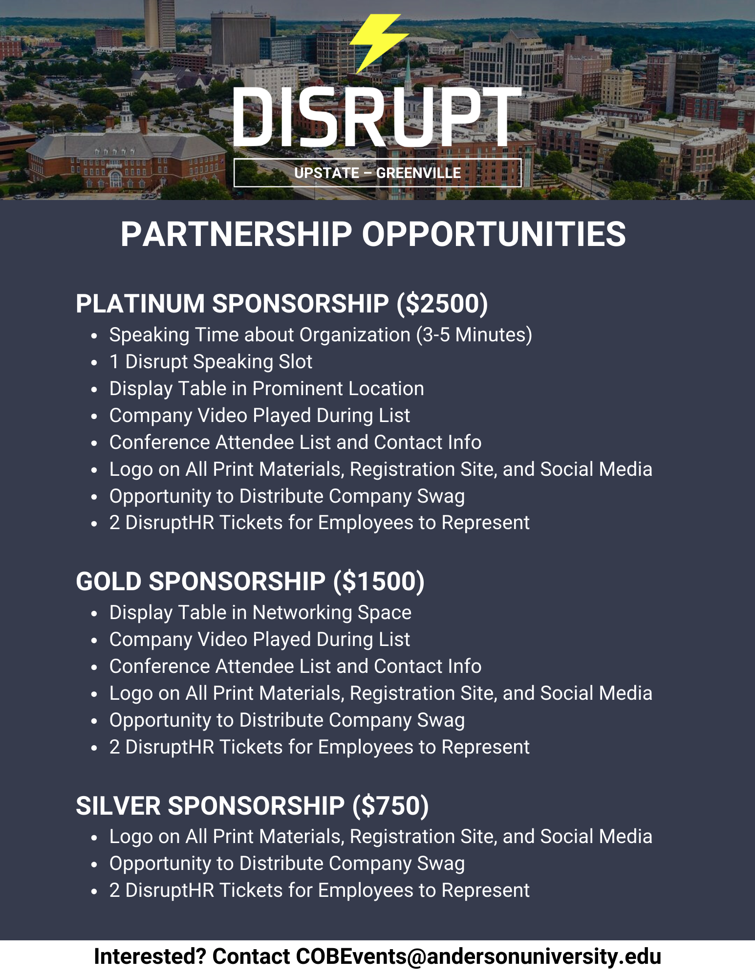 COB - DisruptHR Greenville - 2023 Fall - SponsorshipTuesday, November 14, 2023 at 3:30 PM until 5:30 PMEastern Standard Time UTC -05:00Map and DirectionsUniversity Center of Greenville225 S Pleasantburg DrGreenville, SC 29607United States Doors Open: 3:00pmEvent Time: 3:30pm - 5:30pm About DisruptHR: DisruptHR was founded with the belief that the traditional approaches to people and talent are ripe for disruption. It is a global initiative that fosters new ideas and disruptive thinking around talent in the workplace, encouraging leaders across all fields to think differently and be more innovative in the global marketplace. Event Overview: Join us for an afternoon of disruptive discussions and networking as we shape the future of work together. This event is designed as a high-energy information exchange, encouraging the sharing of new and disruptive ideas through a series of succinct, powerful talks. Each speaker will have just 5 minutes to share their insights, with slides rotating every 15 seconds, offering a dynamic and fast-paced environment to share and absorb innovative ideas.Sign up page Call for Sponsors: Are you looking to amplify your organization’s presence and engage with forward-thinking professionals? Become a sponsor for DisruptHR Greenville! Our exclusive Platinum, Gold, and Silver sponsorship packages offer a range of benefits designed to elevate your brand and foster meaningful connections within the industry. By partnering with us, you’ll gain unparalleled exposure, align your brand with innovation and thought leadership, and have the opportunity to network with a diverse group of professionals passionate about the future of work. Don’t miss this chance to showcase your commitment to HR innovation and community development. For more details on sponsorship opportunities and to secure your spot, please contact COBEvents@andersonuniversity.edu.Registration is no longer available because the registration deadline has passed.